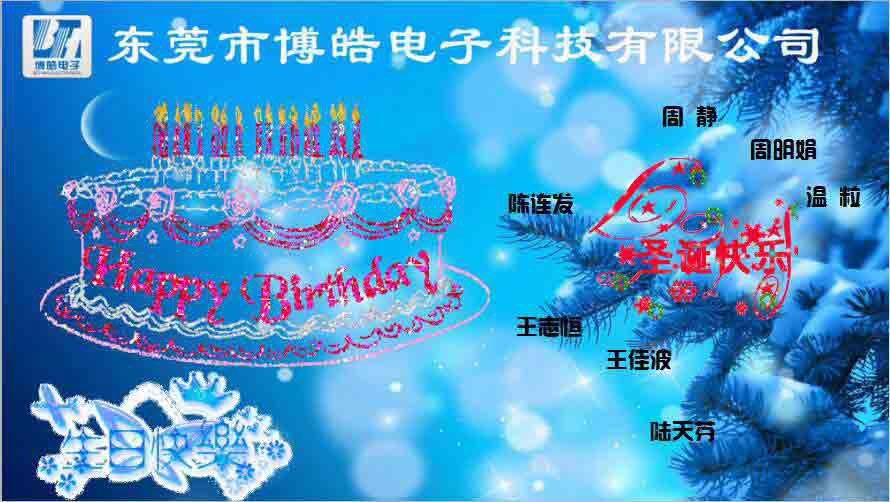 12月24日晚上八點,博皓硅膠按鍵廠舉行了年終員工生日會。12月份壽星一共有7位,來自不同的硅膠生產(chǎn)部門。本次活動為2016年博皓電子舉行的12期生日會活動畫上了圓滿的句號。