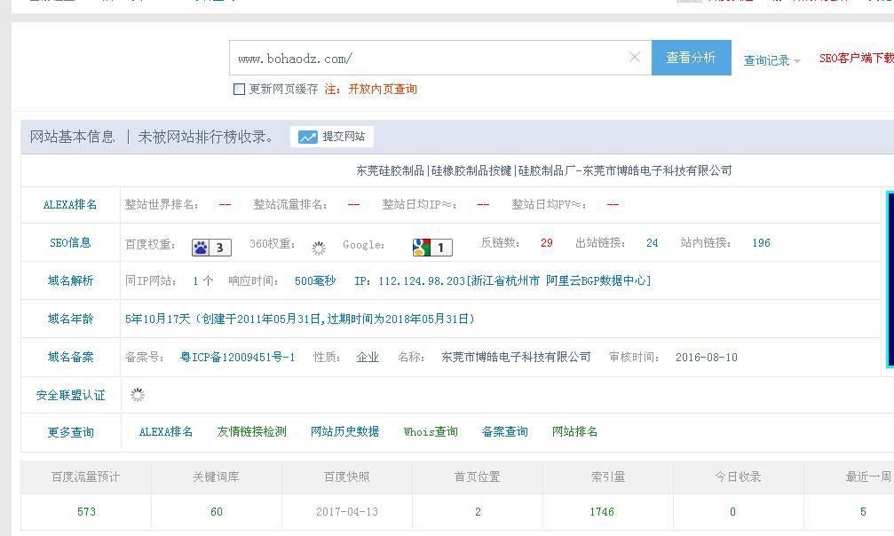 今天早上小編查詢博皓電子官網(wǎng)的站長的SEO數(shù)據(jù),發(fā)現(xiàn)一個不小的驚喜,那就是博皓電子(m.sydafoundation.net)官網(wǎng)百度權(quán)重到3了。之前小編一直在心中提問,硅膠制品行業(yè)的官網(wǎng)可以優(yōu)化到3不?當(dāng)時心中是認(rèn)為不太可能的,今天也終于實(shí)現(xiàn)了。