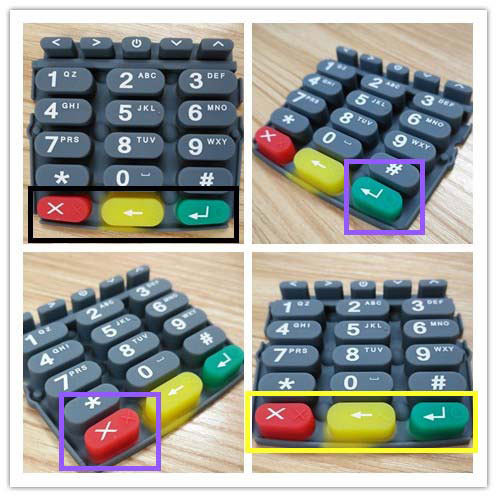 由于盲人只能靠觸覺識(shí)別,所以這些盲文都是采用刻字工藝,直接模壓一體成型。而不需要像絲印一樣再添加一道工序。不過,現(xiàn)在帶有硅膠按鍵產(chǎn)品的使用人群多樣性使得按鍵表面一般是有絲印字符和凹凸盲文字符兩種。就好比博皓硅膠制品廠以前生產(chǎn)的一款POS機(jī)硅膠按鍵,如下圖: