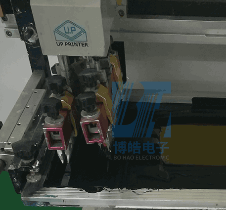 下面來到絲印部門,圖中是絲印黑色油墨,網(wǎng)版上是黑色的油墨,只需按一下開關(guān),機(jī)器就會(huì)從左刷到右,硅膠按鍵完成一次字符印刷