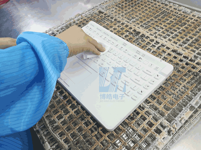 醫(yī)用硅膠鍵盤按鍵出紅外線烤箱后,需要進(jìn)行表面清理,準(zhǔn)備進(jìn)入下一道工序。