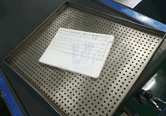 絲印好的醫(yī)用硅膠鍵盤按鍵,經(jīng)過人工一個(gè)一個(gè)字檢測,確認(rèn)無誤后,放入鐵盤中,進(jìn)入紅外線流水線烤箱烘烤,因?yàn)樾枰€(wěn)固一下字符油墨,增強(qiáng)字符使用壽命,避免被摩擦掉