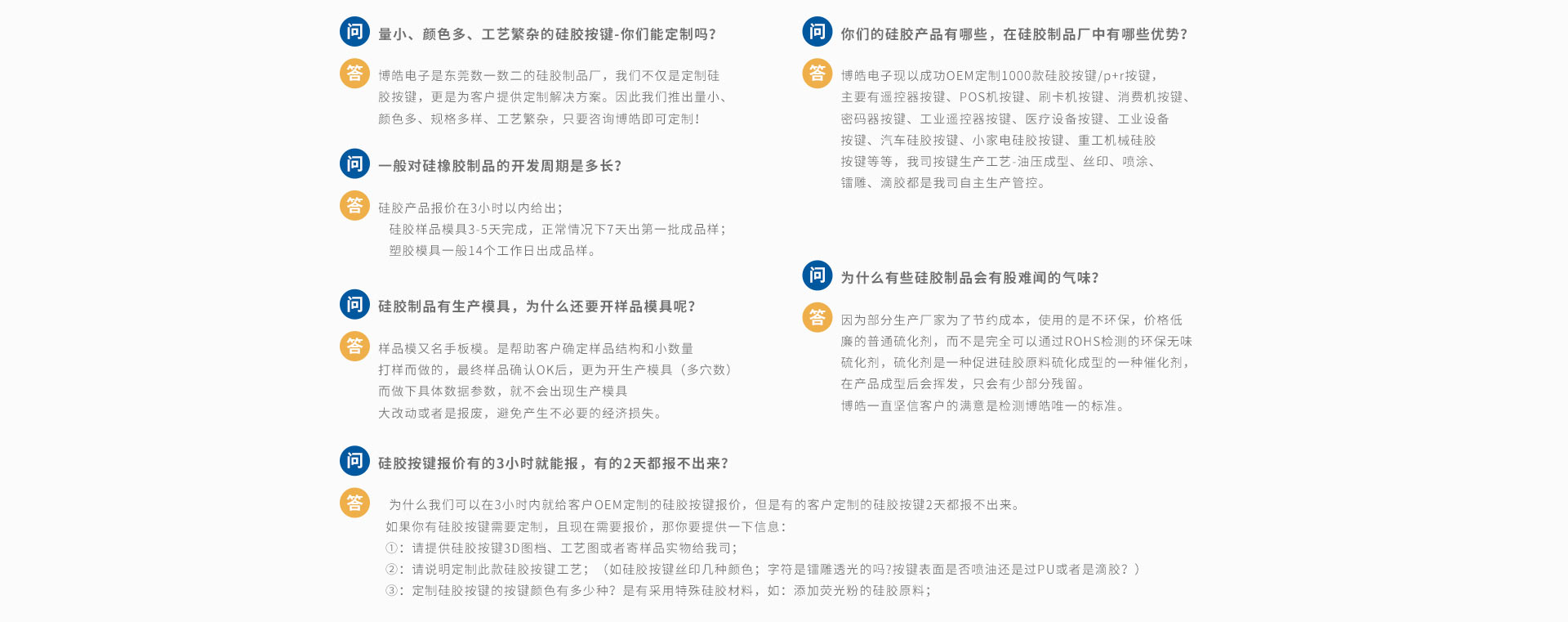 2014年國(guó)外重型機(jī)械機(jī)車控制器面板開始流行使用硅膠材質(zhì),國(guó)內(nèi)的徐州重工、三一重工、柳州重工等都開始紛紛嘗試,博皓電子也正是以為專注硅膠按鍵開模定制,車間80-90%均是生產(chǎn)硅膠按鍵,工藝齊全獲得很多客戶的信任,最終達(dá)成長(zhǎng)期合作。